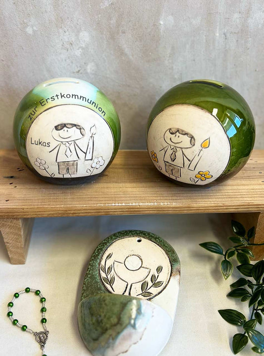 Ob zur Erstkommunion, Taufe oder Hochzeit – diese liebevoll gestaltete Keramik-Spardose mit individuellem Namen ist ein einzigartiges Geschenk. Perfekt, um Geldgeschenke stilvoll zu überreichen und eine bleibende Erinnerung zu schaffen.