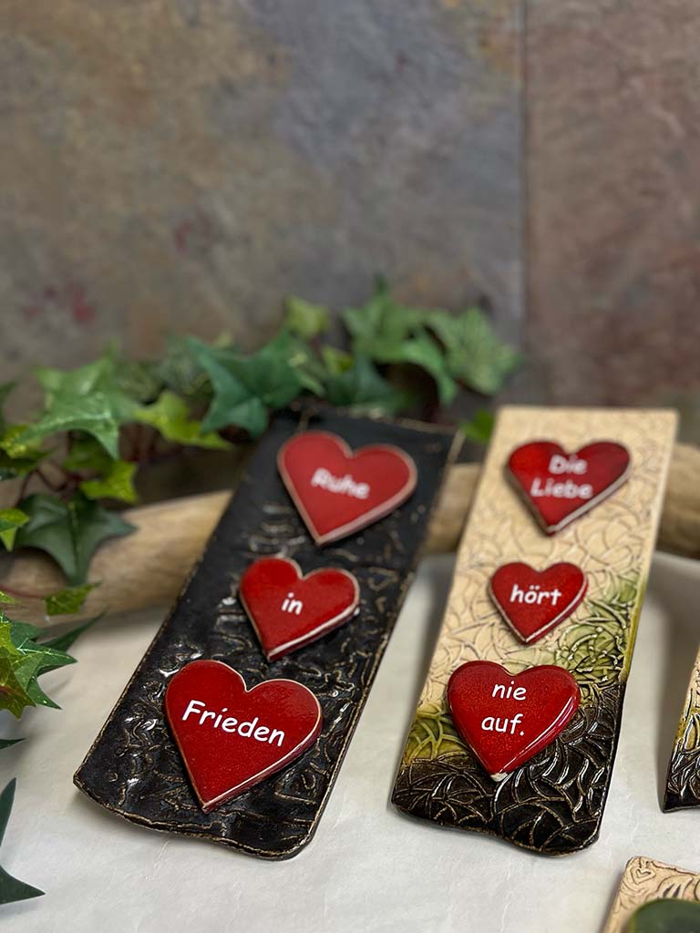 Die liebevoll gestalteten Grabschmuck-Herzen aus hochwertiger Keramik sind ein symbolisches Zeichen für Liebe und Erinnerung. Schlicht und wetterfest, setzen sie einen besonderen Akzent an der Ruhestätte.